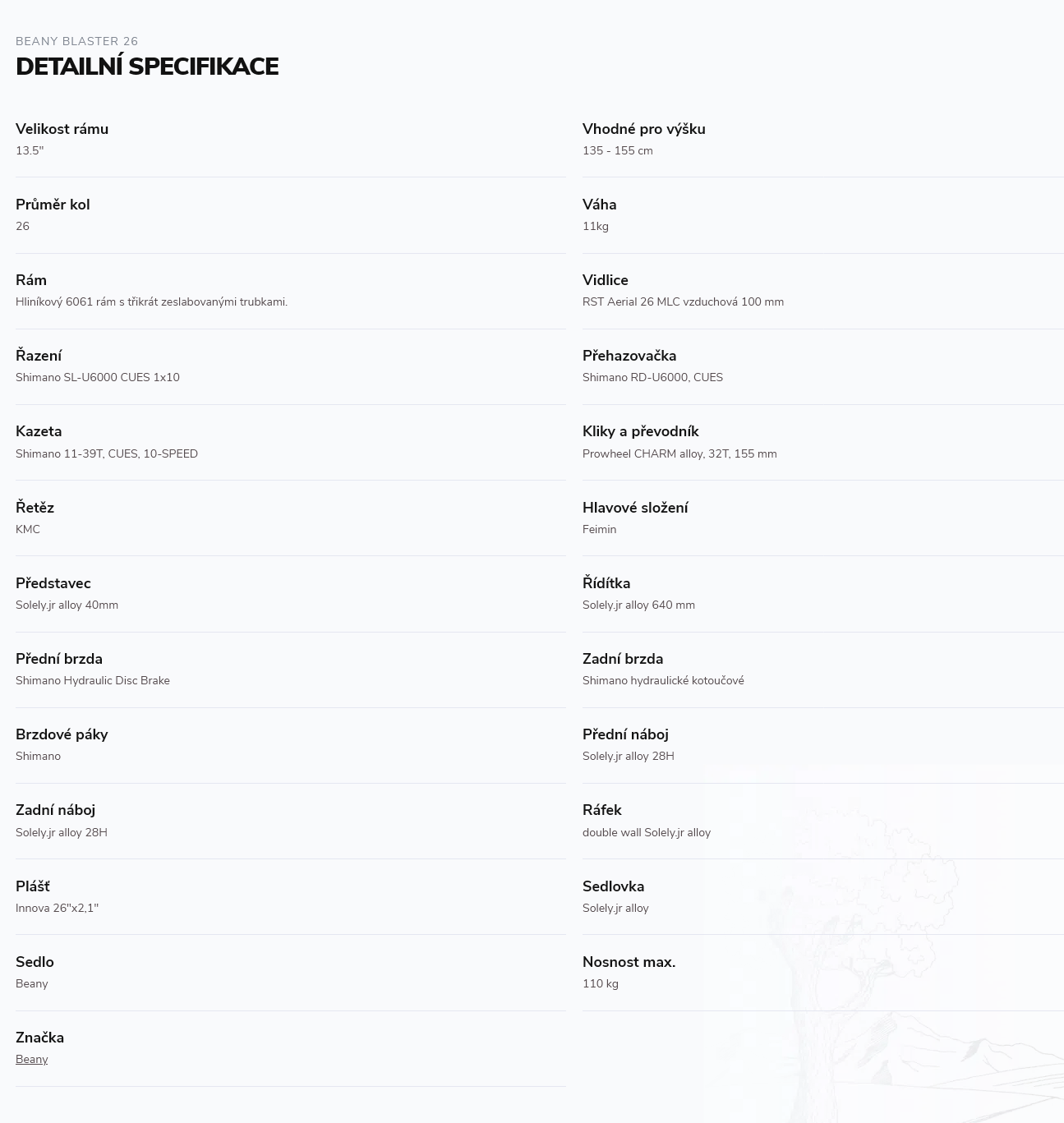 BLASTER 26 je určen pro zkušenější děti, které už mají už něco najeto a rády testují, co všechno v terénu vyjednou, přeskočí a zdolají. Abychom jim jejich zábavu v sedle maximálně zpříjemnili a zjednodušili, vybavili jsme Blaster mimo jiné vzduchovou vidlicí RST, desetistupňovým řazením Shimano Deore a kotoučovými hydraulickými brzdami Shimano. Víme, že oba - dobrodruh i závodník - potřebují kvalitní vybavení, aby se dostali tam, kam jiní už ne.